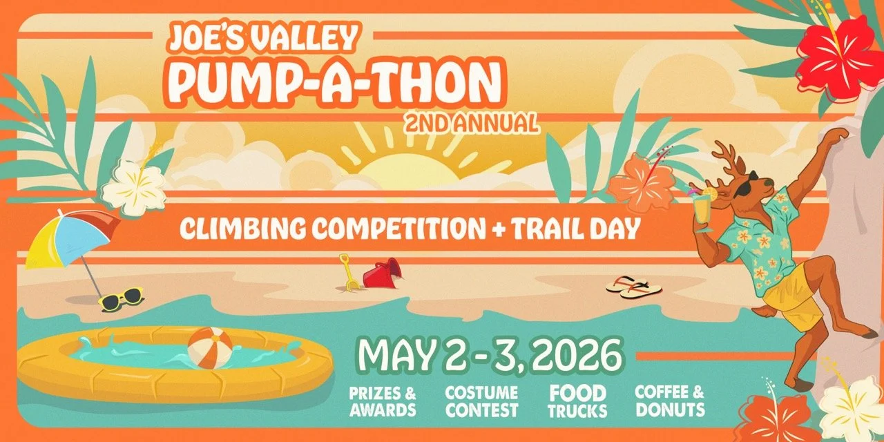 KAYA is excited to again partner with Joe’s Valley Climbing and Community as the official scorekeeper and guidebook for the Pump-A-Thon. This event is 1 part endurance bouldering competition, 1 part beach party at New Joe’s, 1 part fundraiser for our summer youth camps, and 1 part stewardship. So come, support a good cause, test your feats of strength, wear the cheesiest beach attire you can find, win swag and prizes, partake in a trail day, and hang out with new and old friends!